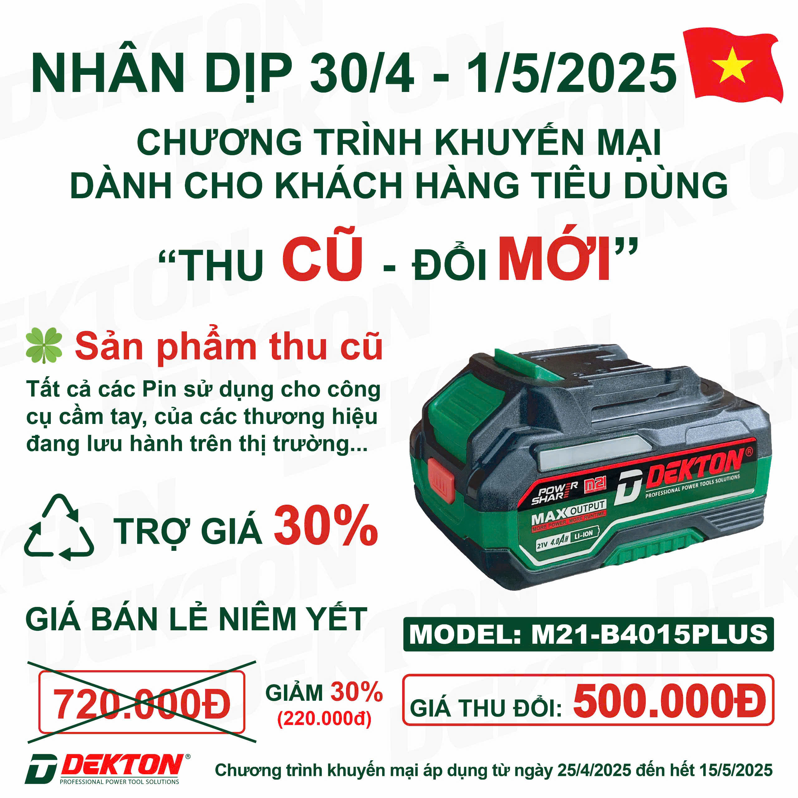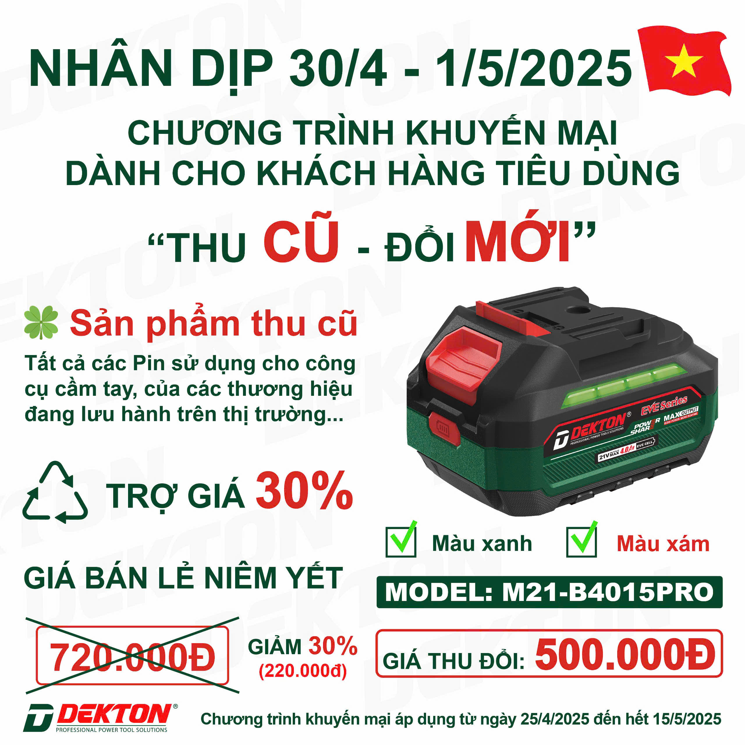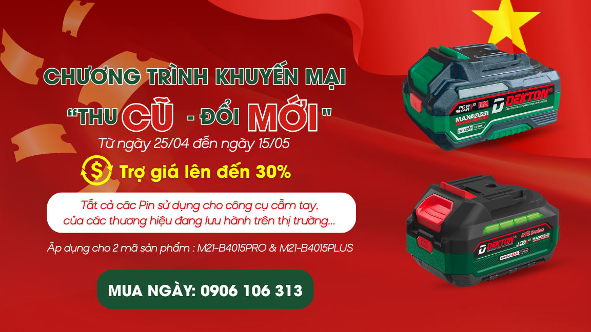 Nhân dịp lễ lớn 30/4 – 1/5/2025, Dungcuchinhhang.com gửi tới chương trình ưu đãi hấp dẫn “Thu cũ – Đổi mới” dành cho khách hàng tiêu dùng của thương hiệu thiết bị cầm tay nổi tiếng Dekton. Đây là cơ hội tốt để Anh/Chị vừa tiết kiệm chi phí, vừa nâng cấp pin công cụ cầm tay sang thế hệ mới chính hãng, an toàn và hiệu quả hơn trong công việc.