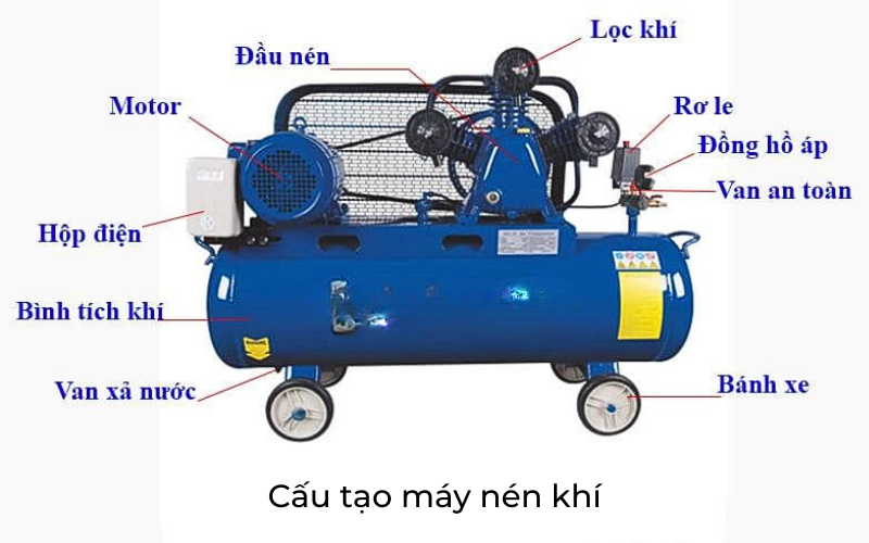 Hiện nay, có nhiều loại máy nén khí khác nhau trên thị trường và mỗi loại lại có cấu tạo và công dụng riêng. Nhưng nhìn chung, máy nén khí thường có những bộ phận cơ bản sau: