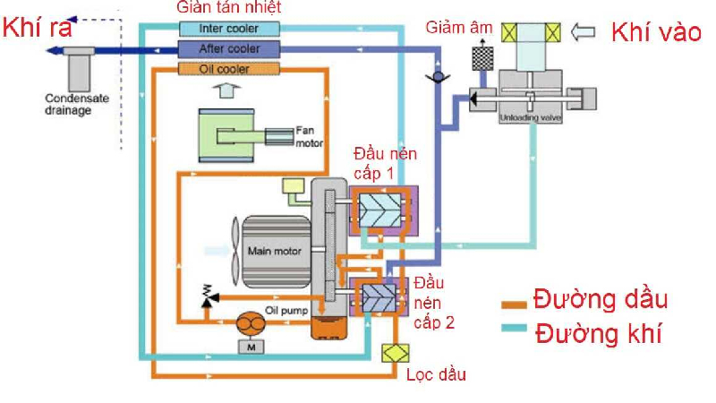 - Phần dầu sẽ được giữ lại trong bình chứa, rồi sau đó đi qua van hằng nhiệt để kiểm soát nhiệt độ. Nếu dầu quá nóng, nó sẽ được đưa qua giàn làm mát, rồi qua bộ lọc để loại bỏ tạp chất và quay trở lại đầu nén, tiếp tục chu trình.