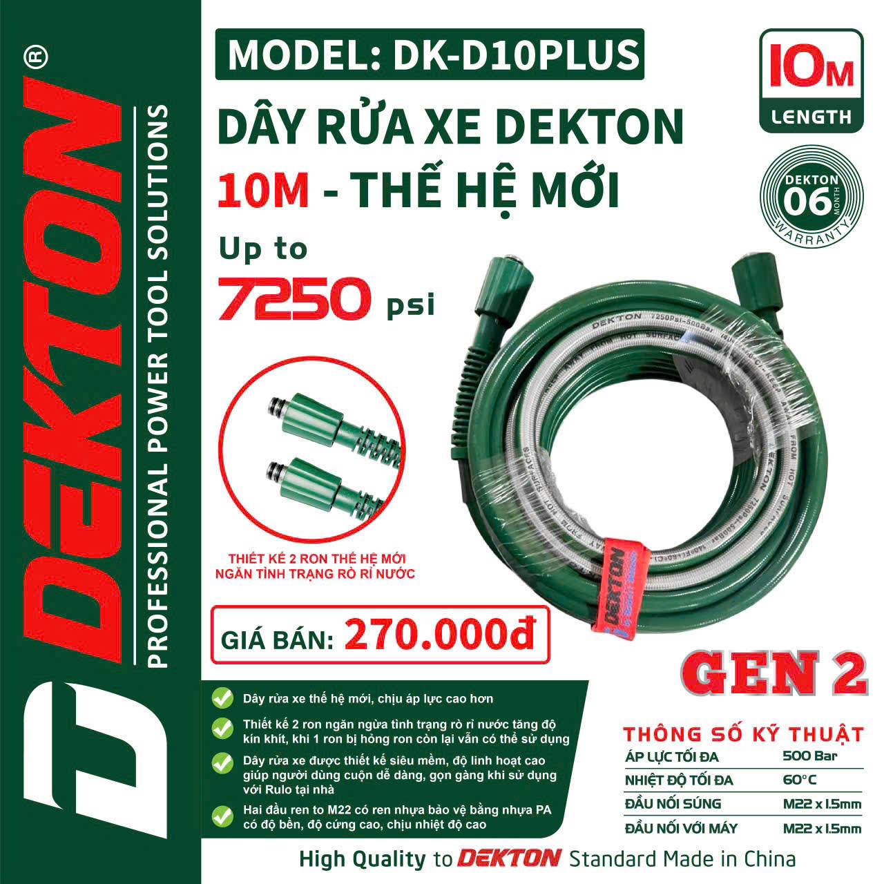 Khi sử dụng máy rửa xe của hãng hay của bất kì thương hiệu nào thì chúng ta cũng luôn cần phải có dây rửa xe để có thể tạo ra áp lực nước mạnh mới làm sạch kĩ các ngóc dơ bẩn. Dây rửa xe 10M Dekton DK-D10PLUS có thể đáp ứng được các yếu cầu đó với khả năng tạo áp lực nước vượt trội.