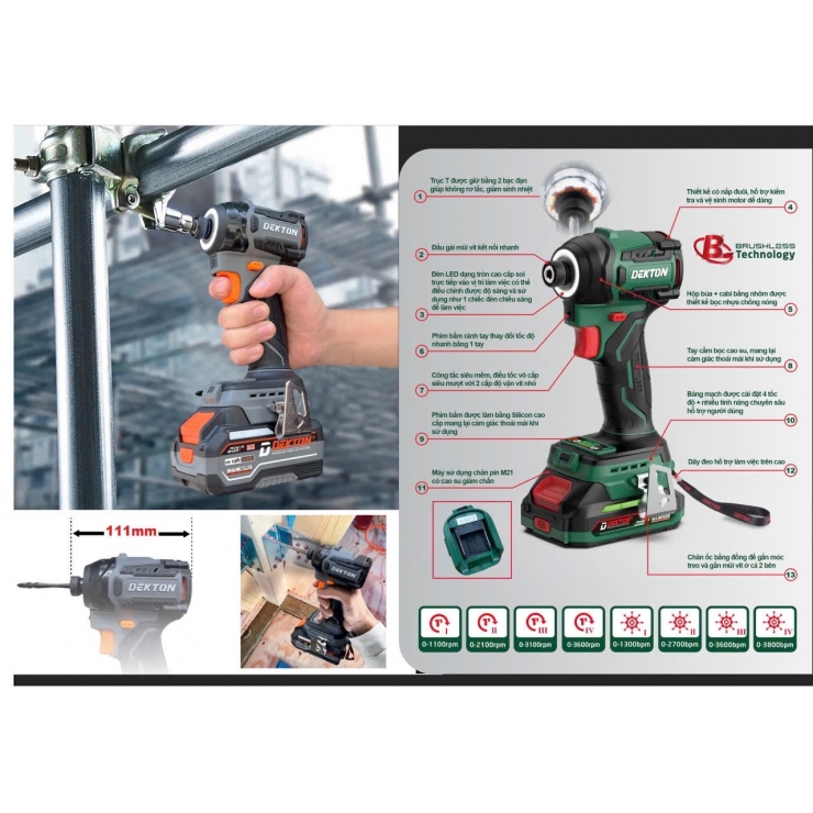 Máy bắn vít Dekton M21-CV250PRO là máy bắn vít brushless (động cơ không chổi than) dùng pin 21V cho hiệu suất cao, bền bỉ và kiểm soát chính xác. Mô-men 250Nm, 4 cấp tốc độ quay và 4 cấp va đập giúp xử lý từ gỗ, tôn đến kim loại dày nhanh – gọn – ít lỗi.