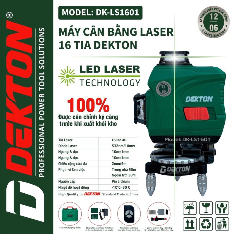 – Máy laser DEKTON DK-LS1601 với 16 tia (tia xanh), kèm điều khiển từ xa bằng remote. Máy sử dụng công nghệ Led laser siêu sáng, tia sáng vẫn thấy rõ trong môi trường có ánh sáng mạnh, vượt trội so với các máy cân bằng khác trên thị trường.