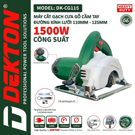 Với công suất 1500W và tốc độ tải là 12500 vòng/phút máy cắt gạch DK-CG115 có thể dễ dàng cắt qua các loại vật liệu cứng.