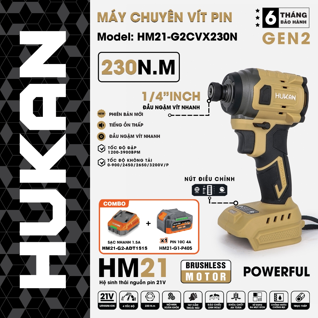 – Tên sản phẩm: Máy chuyên vít pin Hukan HM21-G2CVX230N, 4 Tốc độ, Không chổi than, Lực siết 230Nm