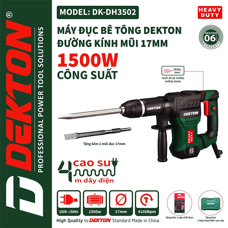 Máy đục bê tông DEKTON DK-DH3502 là phiên bản máy đục có kích thước nhỏ, nhẹ, nhưng lại rất mạnh mẽ của DEKTON. Máy có công suất 1500W và tốc độ không tải 4100 vòng/phút, cung cấp hiệu suất cao trong các tác vụ đục bê tông. Trong bài viết này, Dungcuchinhhang sẽ cung cấp thông tin chi tiết về sản phẩm, những tính năng nổi bật cũng như những lợi ích mà máy mang lại để Anh/Chị dễ dàng đánh giá và chọn mua theo nhu cầu của mình.