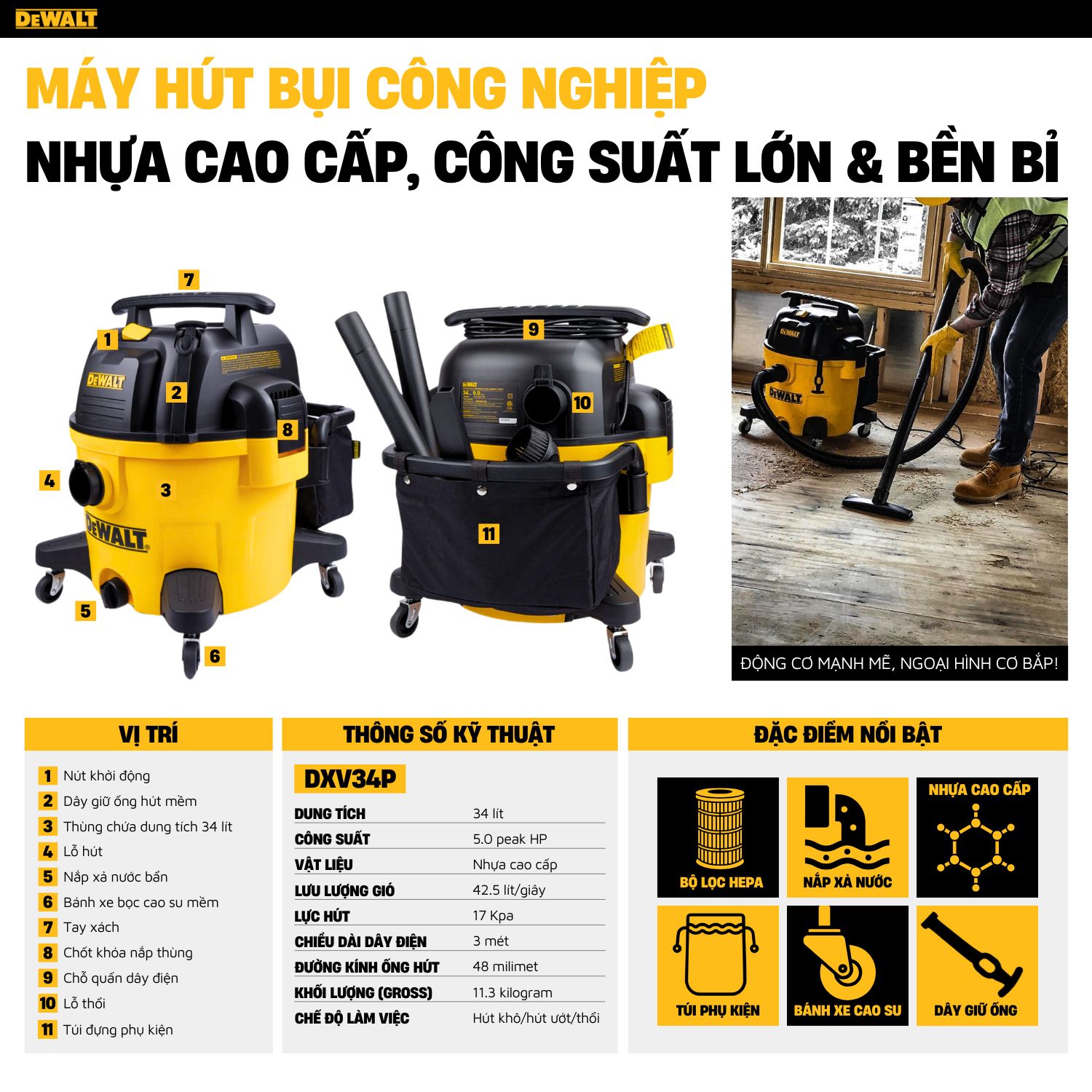 Giới thiệu về máy hút bụi công nghiệp 3 chức năng ướt/khô/thổi Dewalt DXV34P 34L