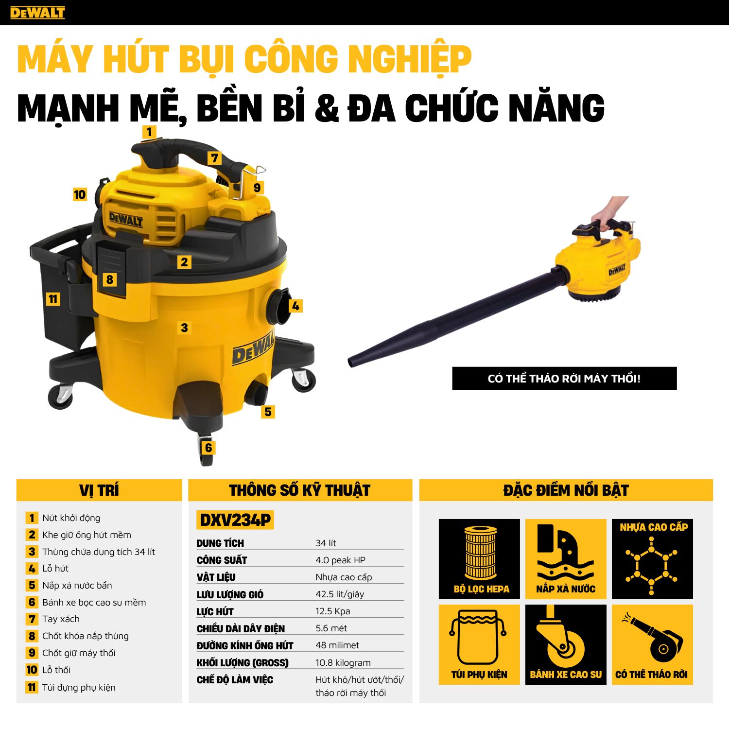 Giới thiệu về máy hút bụi công nghiệp 4 chức năng ướt/khô/thổi và chuyển đổi thành máy thổi cầm tay Dewalt DXV234P