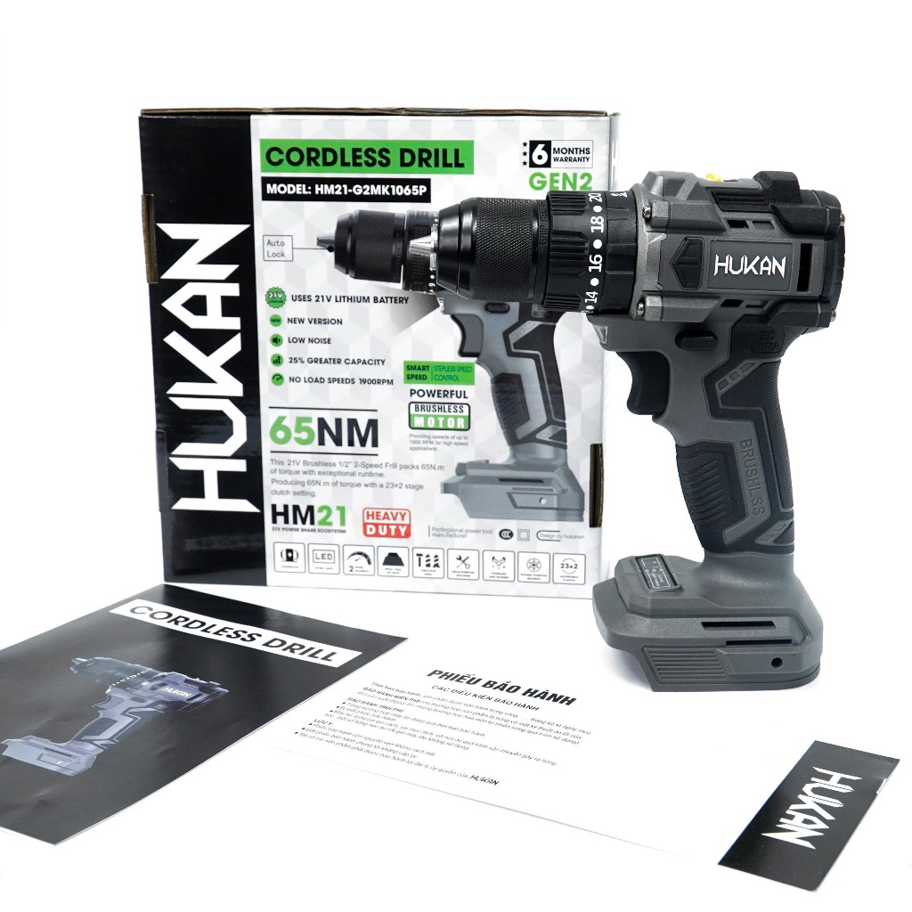 – Tên sản phẩm: Máy khoan pin HUKAN HM21-G2MK1065P, 3 Chức Năng, Không Chổi Than, 10mm, Có khóa trục