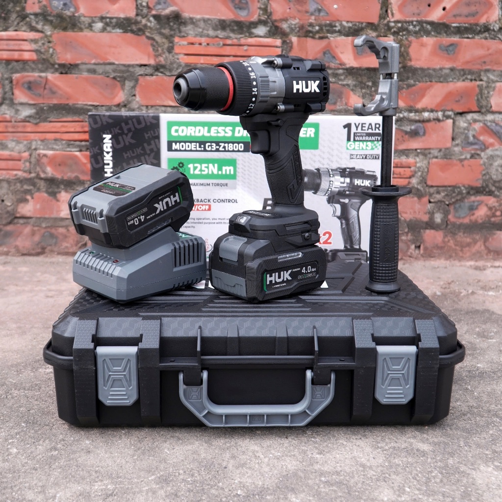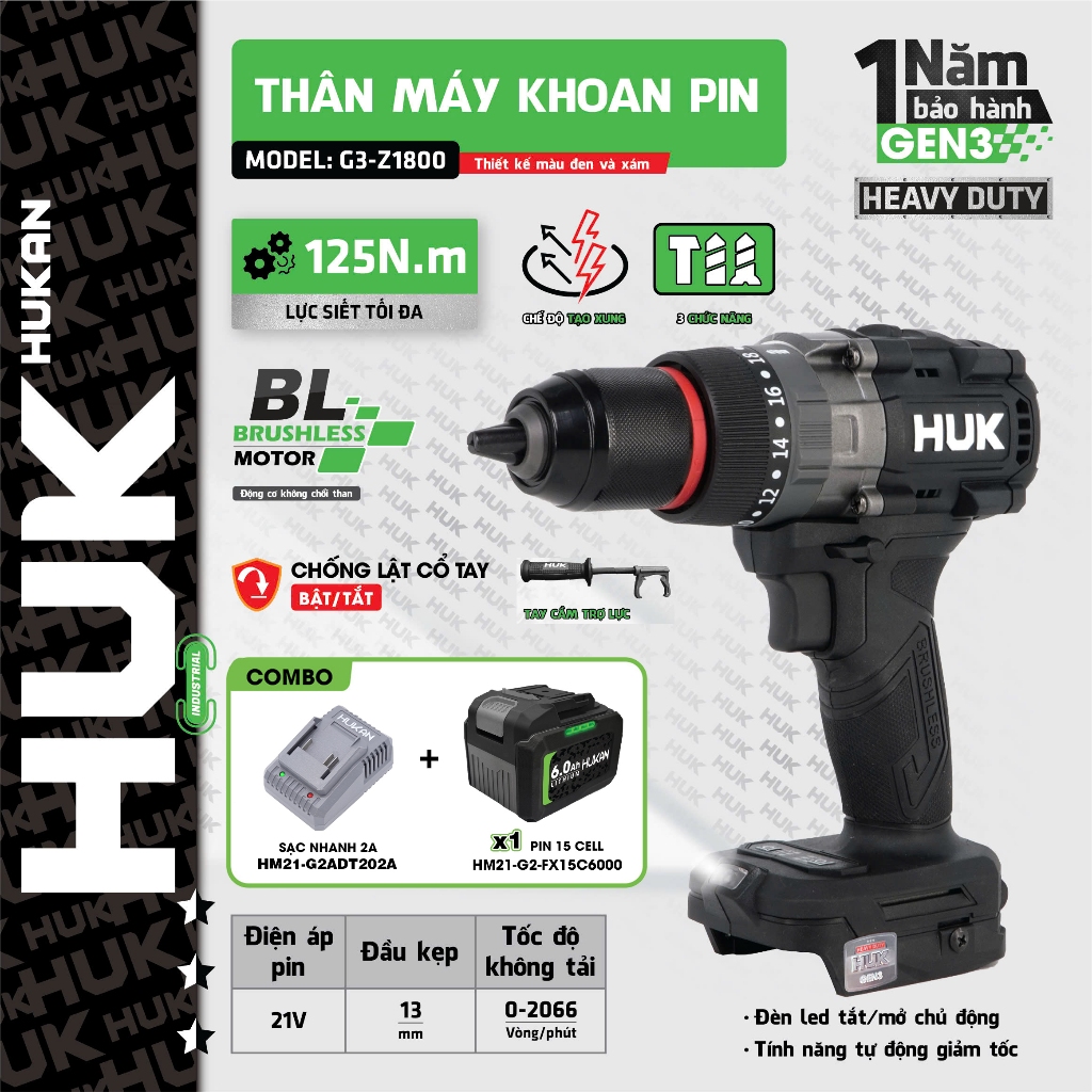 – Tên sản phẩm: Máy khoan pin HUKAN G3-Z1800, Không chổi than 125Nm, Có tạo xung + Chống lật cổ tay