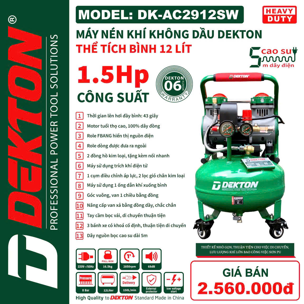 Máy nén khí không dầu 12L Dekton DK-AC2912SW sẽ là một sản phẩm tuyệt vời trong lĩnh vực thiết bị dụng cụ cầm tay. Máy thuộc thương hiệu Dekton cũng là một thương hiệu có uy tín trong lĩnh vực này, từ đó có thể thấy máy sẽ có chất lượng cao và với công suất 1.5HP, dung tích bình chưa lên đến 12L máy hoàn toàn có thể đáp ứng các yêu cầu công việc tại hộ gia đình và các xưởng công nghiệp.