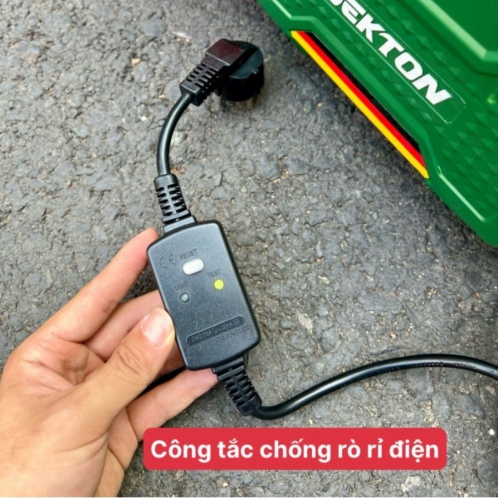 Công tắc chống giật tích hợp giúp bảo vệ người dùng khỏi các sự cố về điện trong quá trình xịt rửa. Đồng thời, tính năng tự động ngắt khi nhả cò giúp tiết kiệm điện năng và bảo vệ động cơ.