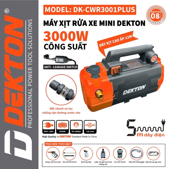 Máy rửa xe chỉnh áp Dekton DK-CWR3001PLUS là dòng máy rửa xe cao cấp của thương hiệu Dekton, sản phẩm được trang bị motor cảm ứng từ (không chổi than) bằng dây đồng 100%, nên khả năng vận hành mạnh mẽ, êm ái và độ bền vượt trội. DK-CWR3001PLUS có công suất cực đại lên đến 3000W, máy dễ dàng đánh bay mọi vết bẩn cứng đầu trên xe máy, ô tô, nền sân, tường, hàng rào hay dụng cụ cơ khí.