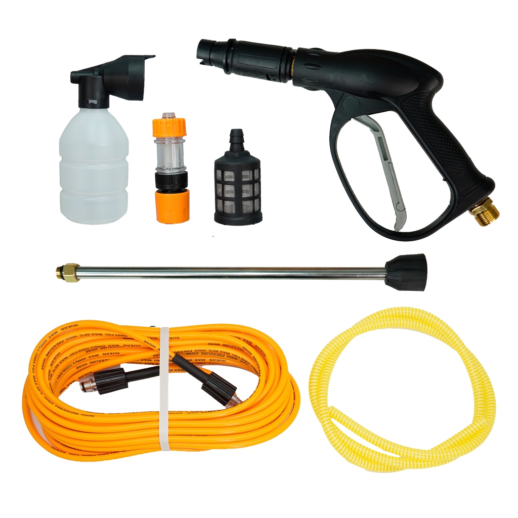 – Bộ sản phẩm gồm: 01 Thân máy + 01 Súng + 01 Nối 30cm + 01 Dây ra 15m + 01 Dây hút 2m + 02 Cút nối nhanh + 01 Lọc rác + 01 Bình bọt.