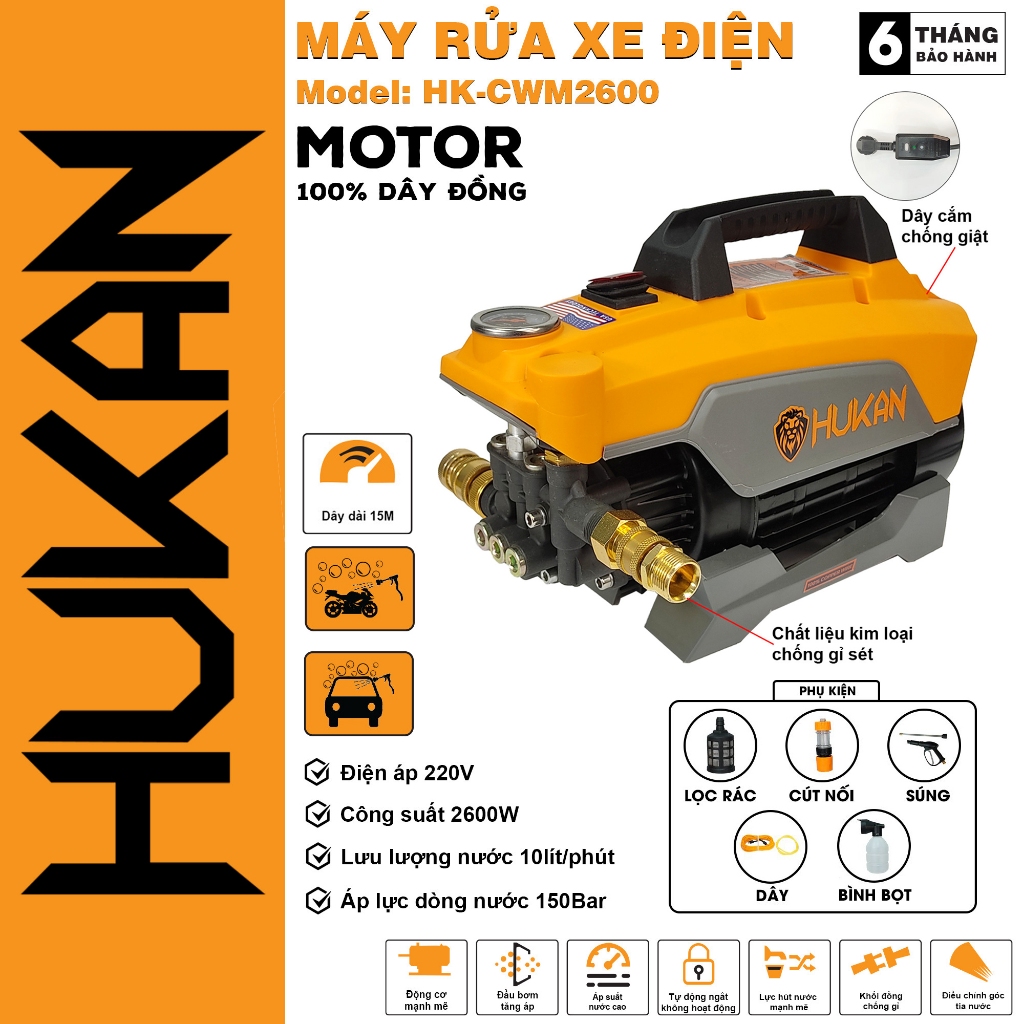 – Tên sản phẩm: Máy rửa xe HUKAN HK-CWM2600,Có chống giật, Công suất lớn 2600W, Động cơ Dây đồng nguyên chất