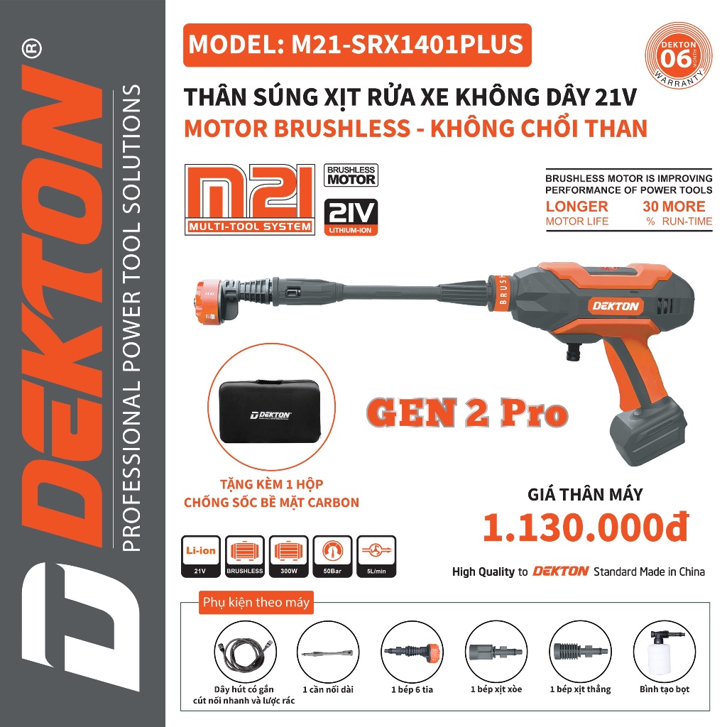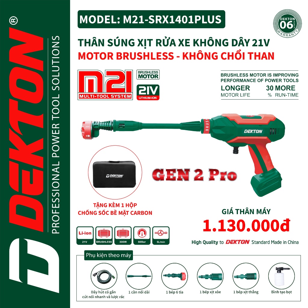Máy Rửa Xe Pin Dekton M21-SRX1401PLUS là sự lựa chọn hoàn hảo cho những ai đang tìm kiếm một giải pháp rửa xe hiệu quả, tiết kiệm thời gian và công sức. Với những tính năng vượt trội và phụ kiện đi kèm, sản phẩm này chắc chắn sẽ đáp ứng mọi nhu cầu làm sạch của bạn, mang lại sự hài lòng và trải nghiệm tuyệt vời trong việc vệ sinh xe cộ và các bề mặt khác.