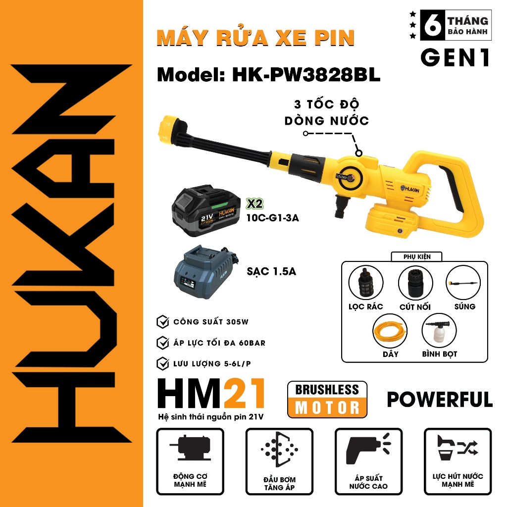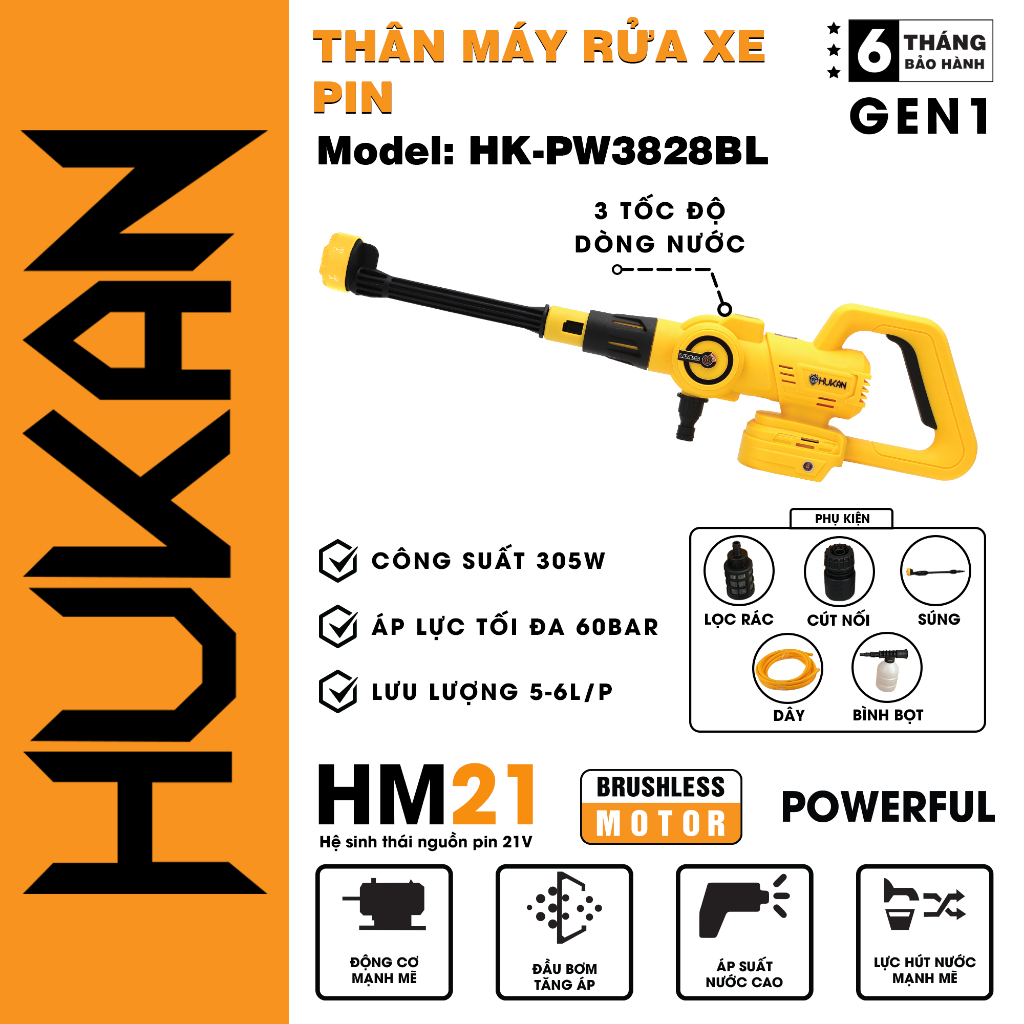 – Tên sản phẩm: Máy rửa xe pin Hukan HK-PW3828BL Động cơ Không chổi than Dễ dàng vệ sinh nhà cửa, điều hoài, tưới cây