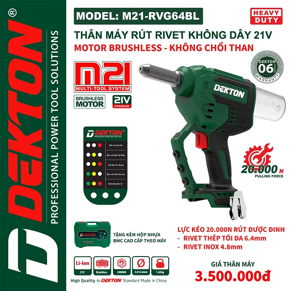 Trong lĩnh vực sản xuất và lắp ráp, máy rút rivet đóng vai trò quan trọng trong việc gắn kết các chi tiết kim loại một cách chắc chắn và nhanh chóng. Dekton, một thương hiệu nổi tiếng về các thiết bị cầm tay chất lượng, đã giới thiệu dòng sản phẩm Máy rút rivet Dekton M21-RVG64BL – một lựa chọn hoàn hảo cho những ai tìm kiếm hiệu suất cao và độ bền vượt trội.