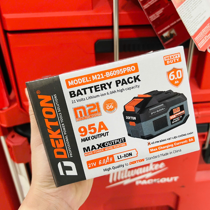 Dekton M21-B6095PRO là pin có điện áp 18-21V dung lượng lên đến 6.000 mAh và được thiết kế chuyên dụng cho các máy cầm tay, máy có dòng tải cao nên mang lại hiệu suất ổn định và thời gian sử dụng dài.