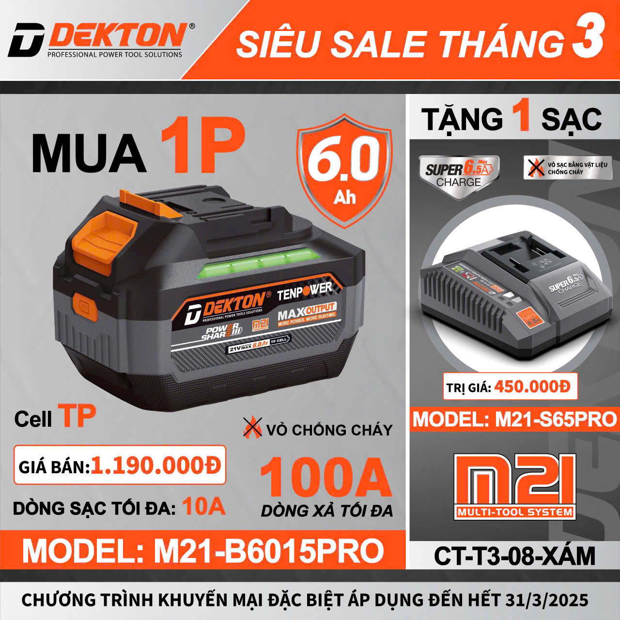 Pin Dekton M21 B6015PRO 6.0Ah là sự lựa chọn hoàn hảo cho những công việc yêu cầu nguồn năng lượng mạnh mẽ và ổn định. Pin với công nghệ mới nhất và các đặc điểm vượt trội, sản phẩm này không chỉ mang lại hiệu suất cao mà còn giúp tiết kiệm thời gian và nâng cao hiệu quả công việc.