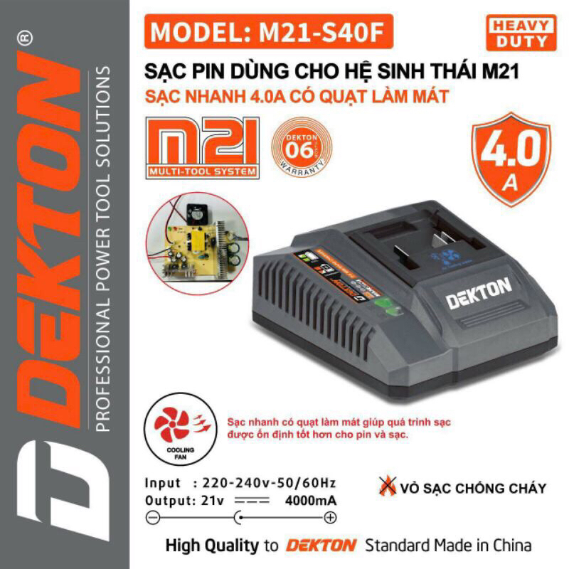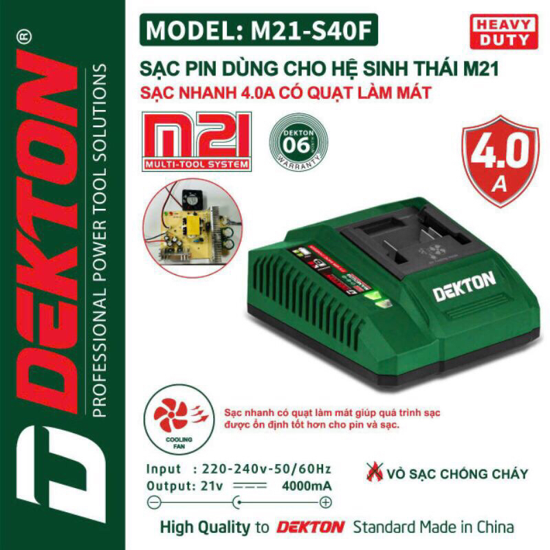 Sạc Dekton M21-S40F là lựa chọn lý tưởng cho những ai tìm kiếm giải pháp sạc pin nhanh chóng, an toàn và hiệu quả. Với khả năng sạc đầy pin chỉ trong 60 phút, quạt tản nhiệt thông minh và chuông cảnh báo tiện lợi, sản phẩm không chỉ giúp tiết kiệm thời gian mà còn đảm bảo an toàn cho pin và người dùng. Tương thích với nhiều loại pin và có chế độ bảo hành 6 tháng, Dekton M21-S40F sẽ là một công cụ hỗ trợ đắc lực trong công việc của bạn.