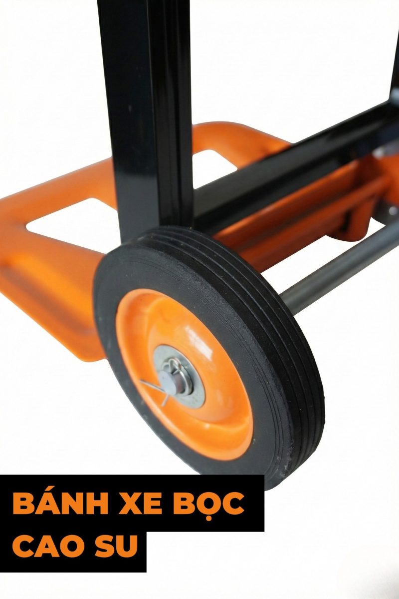 Cặp bánh xe đường kính 145mm làm từ cao su đặc, giúp xe di chuyển êm ái. Anh/Chị có thể yên tâm kéo hàng trên địa hình gồ ghề mà không gây tiếng ồn lớn hay làm trầy xước sàn nhà.