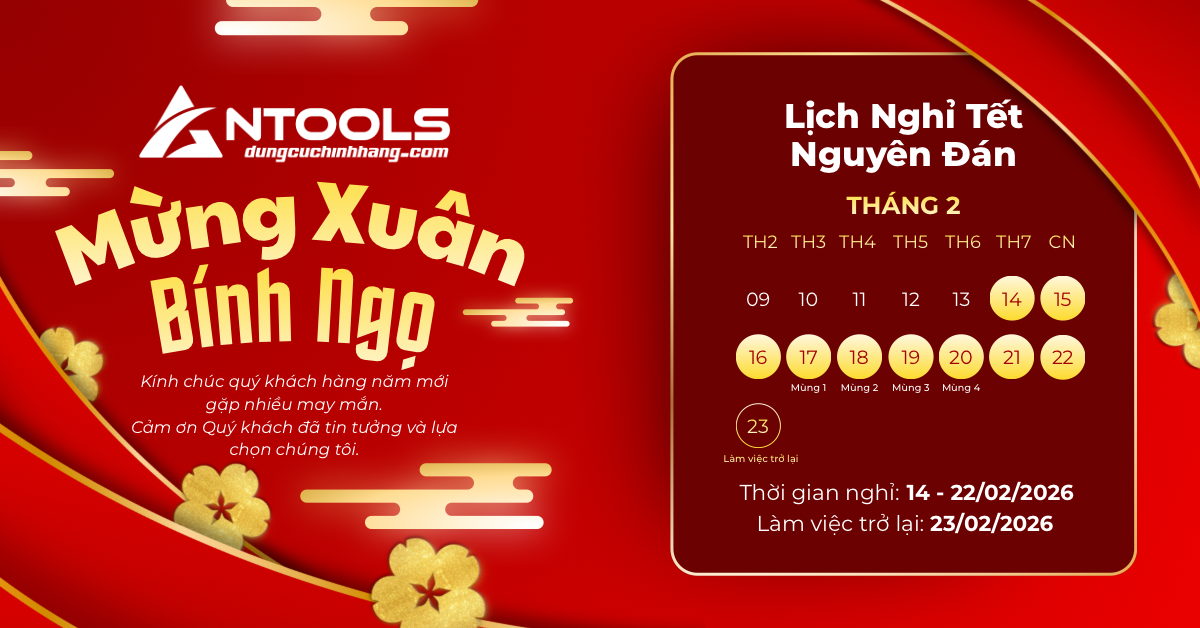 Trong thời gian nghỉ Tết, các hoạt động tư vấn, xử lý đơn hàng, giao nhận và hỗ trợ khách hàng sẽ tạm dừng. An Tools rất mong Quý Khách thông cảm.