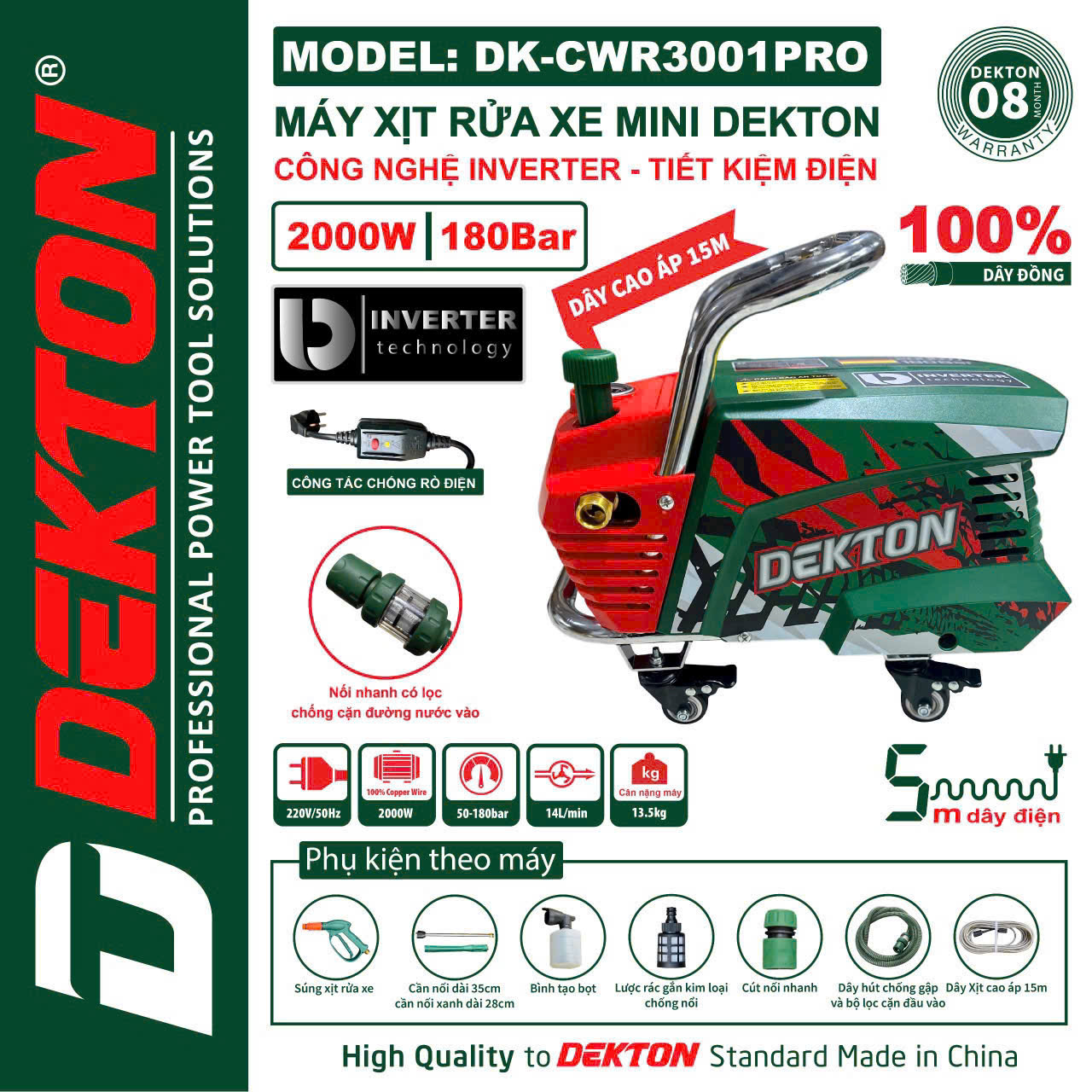 Máy xịt rửa xe mini Dekton DK-CWR3001PRO là sản phẩm nổi bật vừa được ra mắt nhưng đã được săn đón vì những ưu điểm nổi bật mà sản phẩm đem lại. trong phân khúc máy xịt rửa gia đình, công nghiệp,… sản phẩm có công suất mạnh mẽ, bên bì, phù hợp cho việc vệ sinh xe cộ, sân vườn, nhà xưởng, v.v