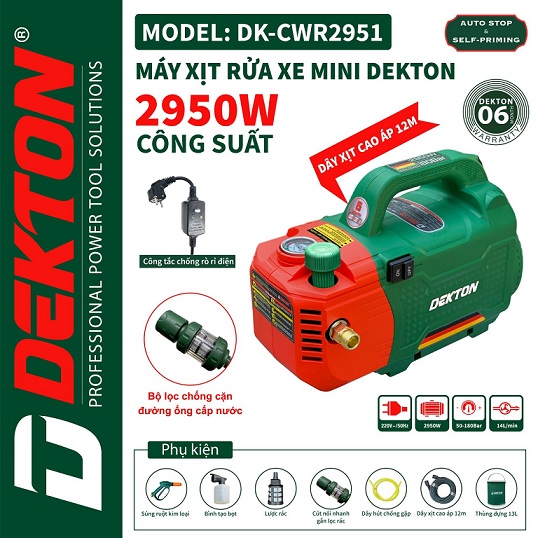 Máy rửa xe chỉnh áp DEKTON DK-CWR2951 là một thiết bị làm sạch hiệu quả, phù hợp dành cho gia đình hay sử dụng công nghiêp. Máy có công suất 2950W và khả năng điều chỉnh áp lực từ 50 đến 180 bar, giúp làm sạch xe nhanh chóng và tiết kiệm nước. Các tính năng tự động ngắt khi nhả cò, tự động hút nước và dây xịt dài 12 mét mang lại sự tiện lợi và an toàn khi sử dụng.